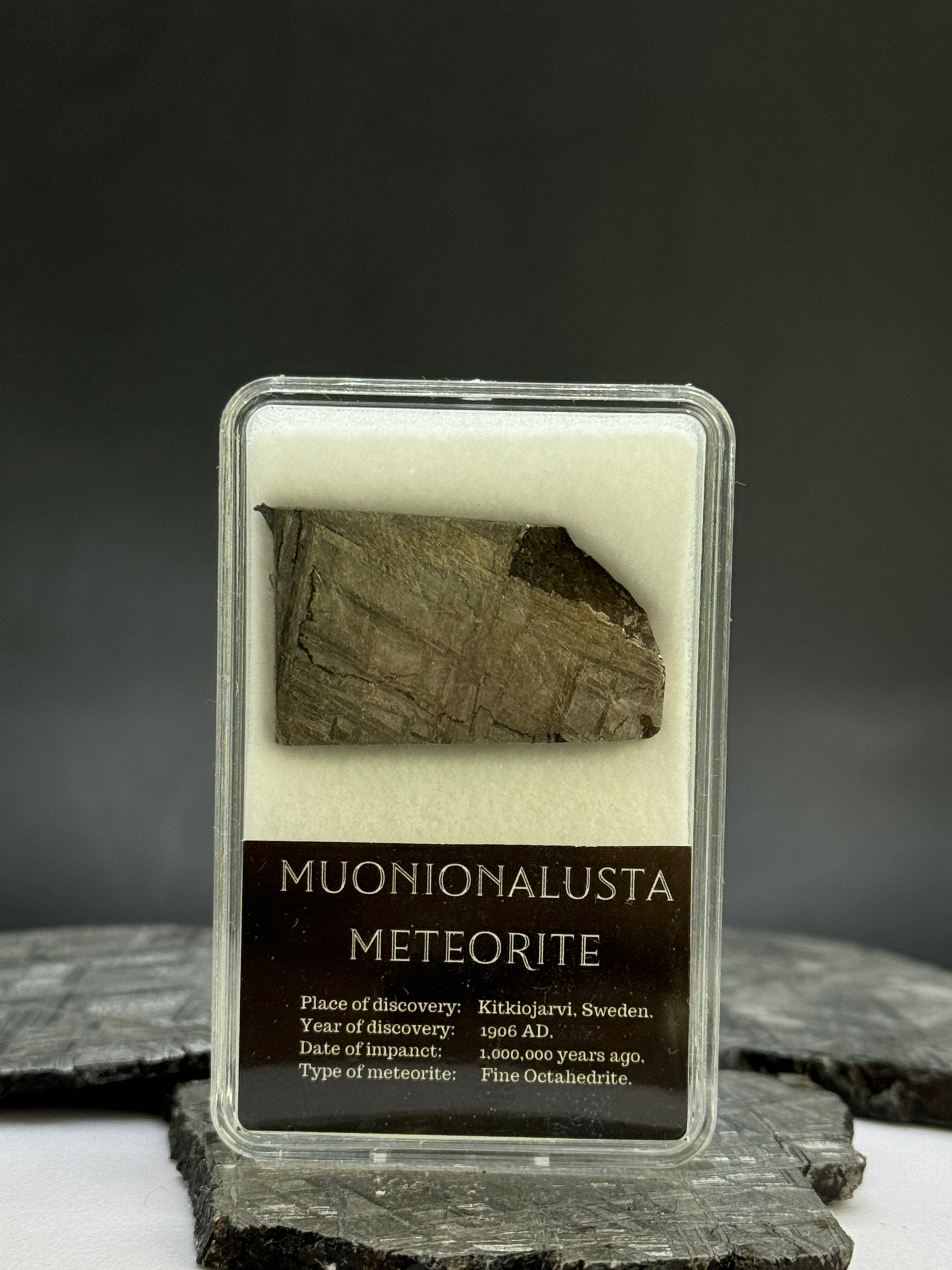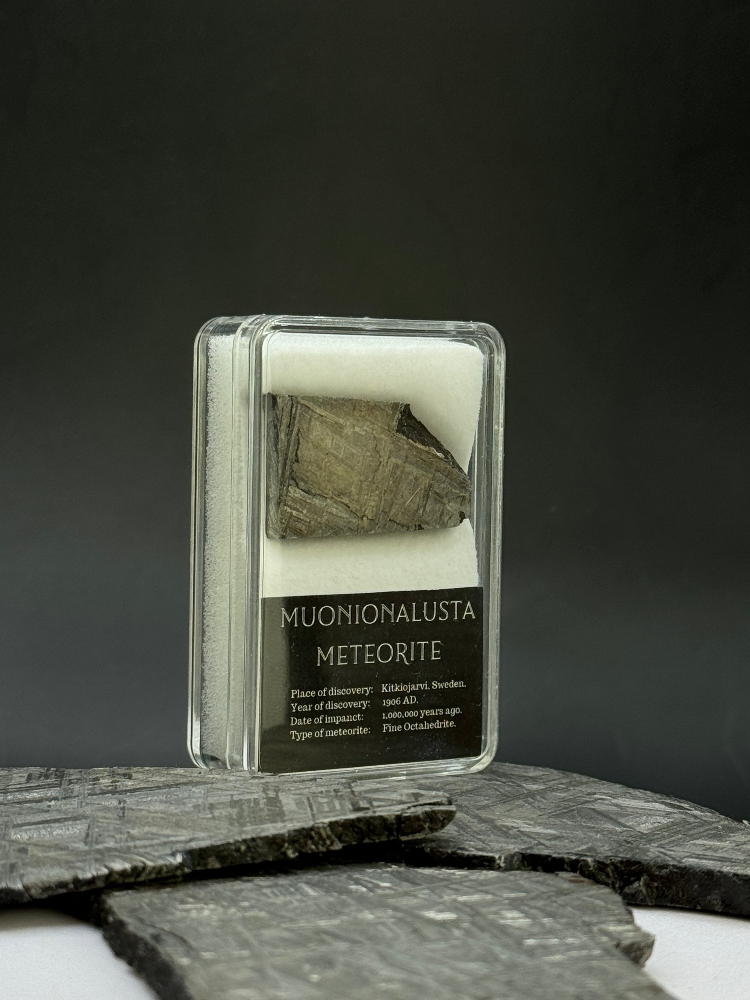 Muonionalusta meteorite in display box. 12,42 grams.